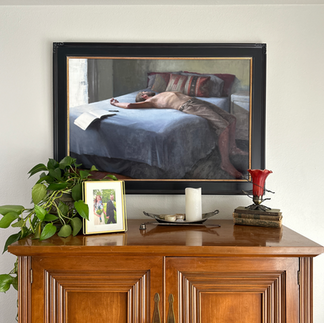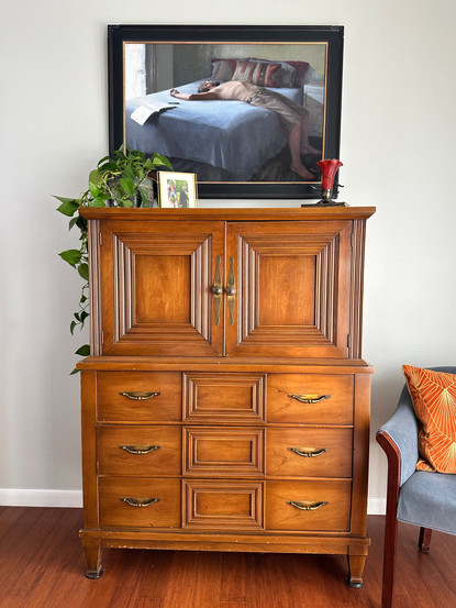 K (Kirsten Savage) is an AMAZING fine artist/ Oil painter, and created all of the art in the space. We wanted to reposition the pieces for a new feel so we opted to place the large portrait over the dresser across from the bed to give that side of the room a strong focal point and color pop. The small nude paintings found new homes in gold frames on either side of the bed to bring a touch of sexiness to the sleeping area. Gorgeous!